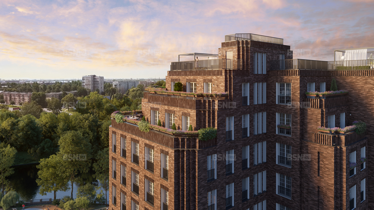 Облик жилого комплекса выполнен в стилистике американского ар-деко. Для отделки фасадов выбран декоративный клинкерный кирпич благородного тёмного оттенка. Три дома деликатно и легко дополняют историческии ландшафт раиона и уравновешивают окружающую cреду.