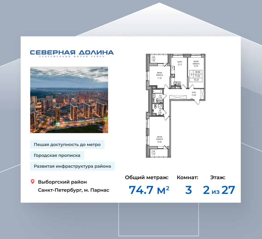 Продается 3-комнатная квартира, 74,7 кв.м. по адресу: Россия, Санкт-Петербург, ул. Заречная, д. 52, корп. 2. Квартира от Застройщика.Возможна покупка квартиры по льготным и специальным ипотечным программам.Цена указана с учетом применения скидки.Условия и актуальные ставки уточняйте у менеджера отдела продаж. Жилой комплекс «Северная долина» расположен в Выборгском районе Санкт-Петербурга, в шаговой доступности от метро «Парнас». Рядом с комплексом проходят магистрали городского значения — КАД, Выборгское шоссе и проспект Энгельса.Качественная отделка квартиры помогает существенно сократить вложения сил, времени и средств в новое жилье. Мы предусмотрели разные варианты отделки, каждый из которых вы можете персонализировать, ориентируясь на свои личные предпочтения в дизайне интерьера — Оптима, Комфорт, предчистовая отделка White Box и черновая отделка.Жилой район «Северная долина» - это место, где уже вовсю кипит жизнь. Здесь спешат на работу, пьют латте на лоджии, ходят в спортзал, бегают на переменах и охотно посещают детский сад. Вы находитесь в балансе городского движения и домашнего комфорта.В шаге от домаЖизнь в наших кварталах удобная, современная и безопасная. Вместе с корпусами активно развиваются коммерческие пространства. На территории комплекса функционирует более 200 объектов торговли и услуг.ИнфраструктураДетские сады и школы оснащены танцевальными и музыкальными залами, бассейнами и необходимым инвентарем для занятий. На территории оборудованы игровые и спортивные площадки с безопасным покрытием. Также мы сотрудничаем с крупнейшими вузами для организации специальных программ развития учащихся.Продуманное благоустройство«Комфорт в деталях» относится не только к жилым квадратным метрам, но и к территории района в целом. Функциональные детские площадки, зоны для хранения велосипедов, продуманный проект озеленения территории и серия модных арт-объектов.Подробнее о проекте и условиях покупки уточняйте у менеджера отдела продаж.