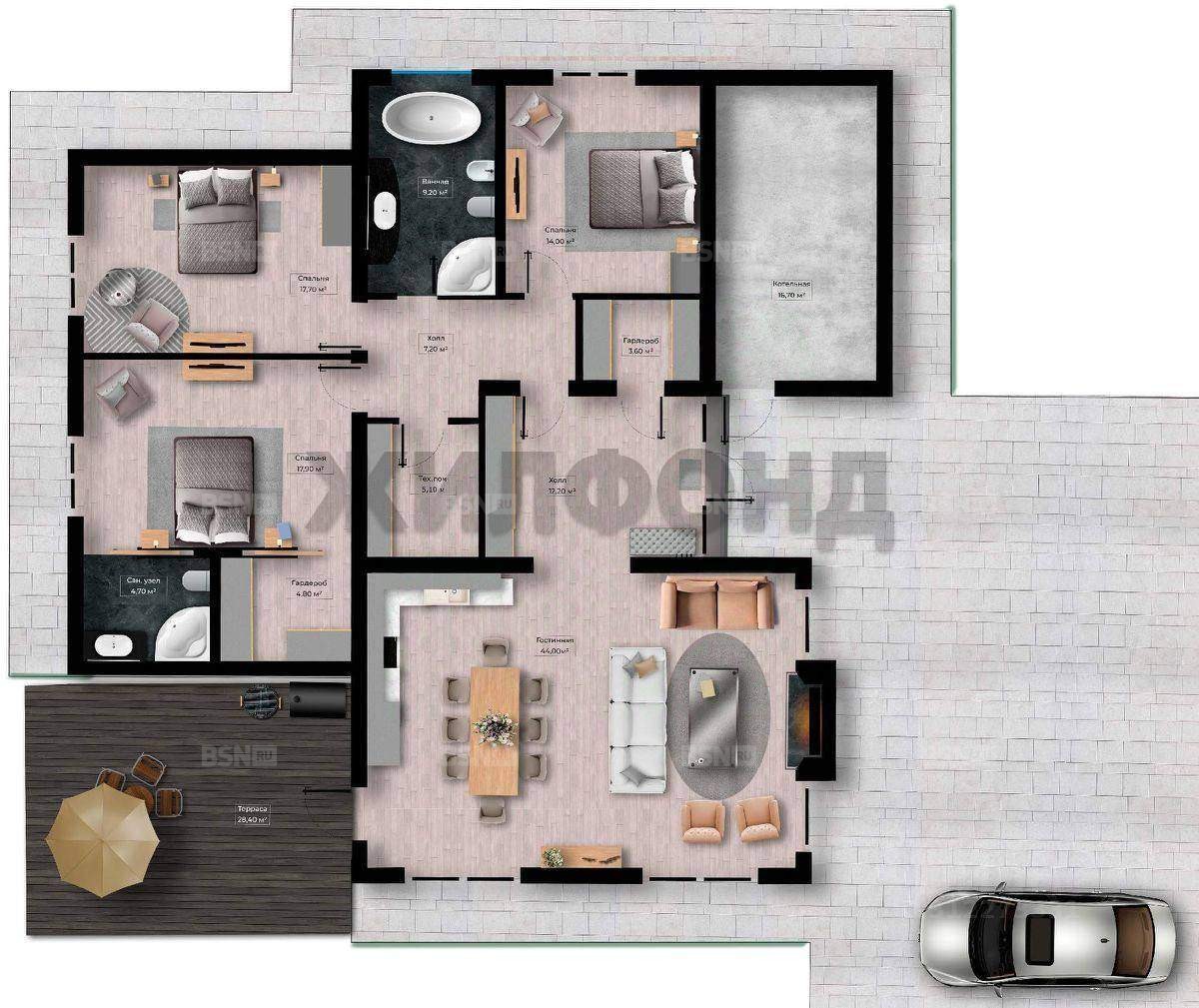 Идеальное зонирование пространства для семьи- кухня-гостиная 44 м?, приватная часть с 3 спальнями, 2 санузла, постирочная, техпомещение, продуманная гардеробная зона, холл.