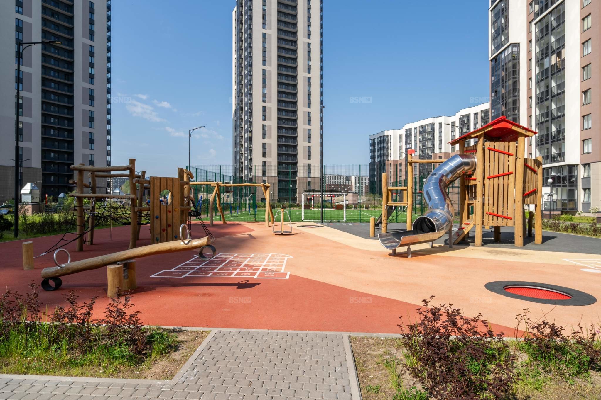 ЖК «Чистое небо» расположен в Приморском районе Санкт-Петербурга в окружении крупных зелёных зон: Новоорловский заказник, Юнтоловский лесопарк, Курортный лесопарк, заказник «Левашовский». На территории комплекса работают две школы, шесть детских садов, медицинский центр, есть детские площадки, воркаут-зоны, пешеходные дорожки, фонтан и зелёный сквер. На первых этажах открыты кофейни, продуктовые магазины, пекарни, салоны красоты.