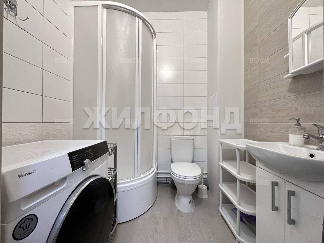 Санузел с теплым полом, сантехникой от застройщика, стиральной машиной с сушкой, двумя полочками и зеркалом.