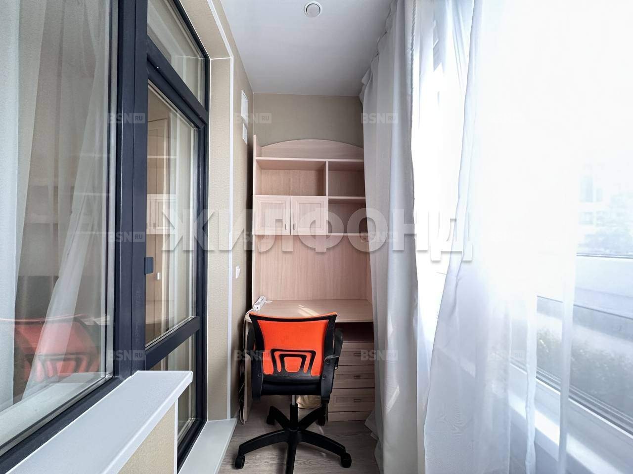 Квартира расположена на высоком первом этаже, пол лоджии начинается на уровне 170 см от земли. Лоджия утеплена, оснащена теплым полом, ламинатом, двухкамерными стеклопакетами с антивандальными стеклами и тонировкой по проекту. Она полностью изолирована и может использоваться как отдельное жилое помещение - спальня или кабинет, оборудованный креслом-кроватью и компьютерным столом, с учетом расстановки мебели и освещением.