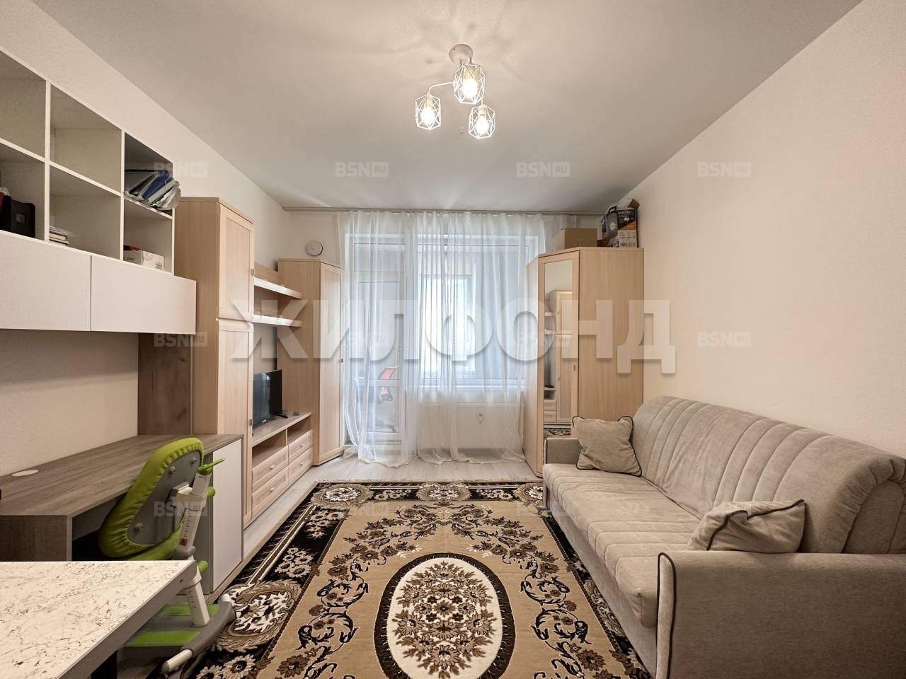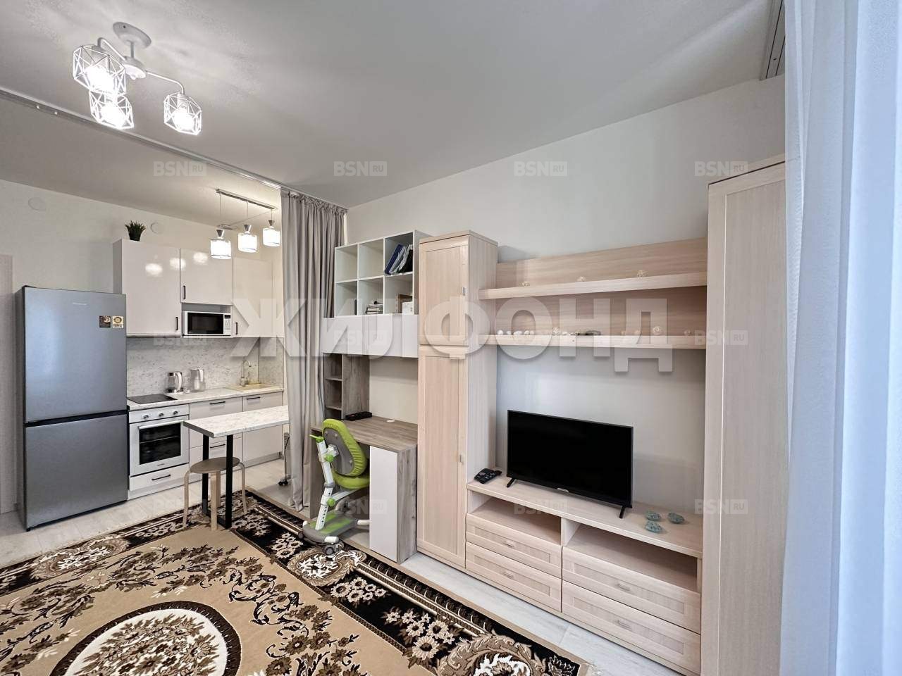 Зонирование комнаты выполнено с помощью штор Blасk Оut, есть мебель - шкафы, телевизор, диван и кресло с ортопедическими свойствами.