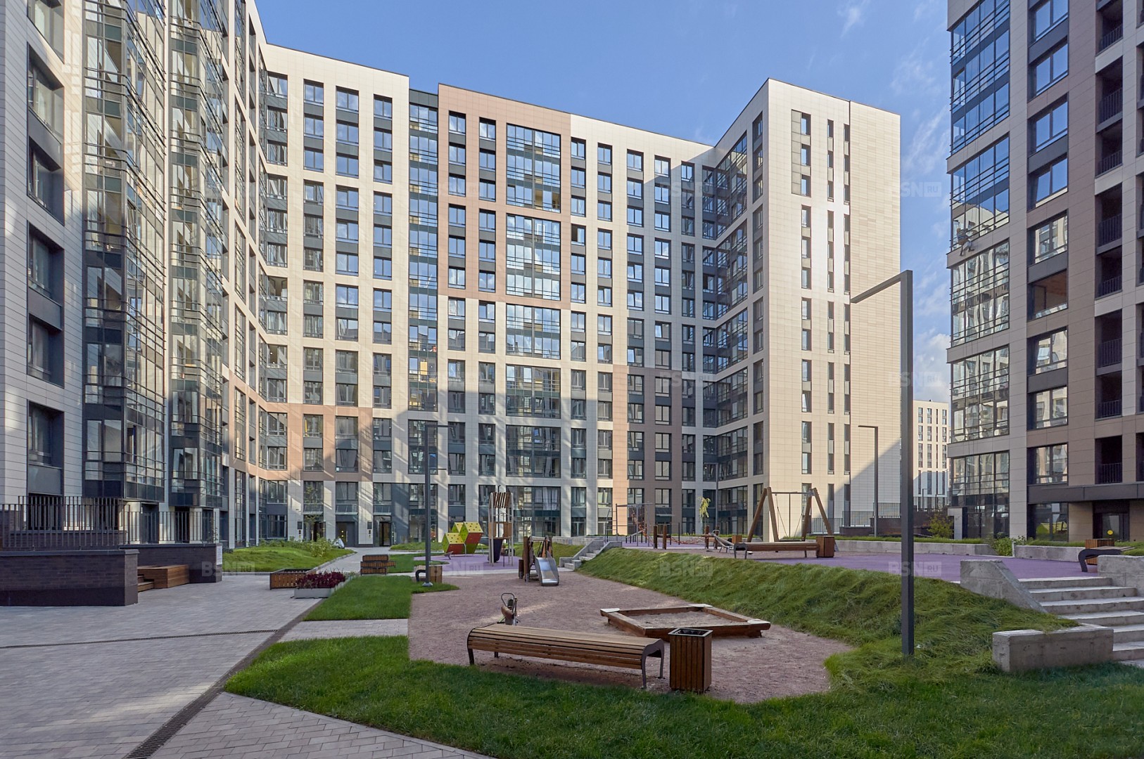 В комплексе 9 жилых корпусов, связанных друг с другом удобной проездной аллеей, имеется собственное внутридворовое пространство, при этом приватные дворы полностью свободны от транспорта. Безопасность в парадных и паркингах обеспечивается единой системой видеонаблюдения.