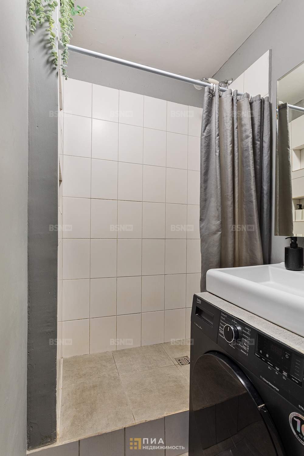 Полноценная ванная комната с душевой кабиной и стиральной машиной.