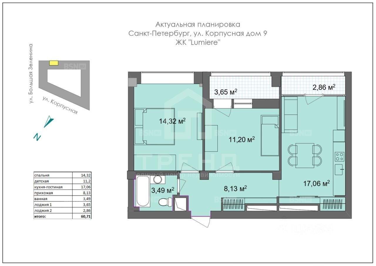 Квартира расположена на 9 этаже десятиэтажного монолитного дома, построенного в 2013 году. Высокие потолки (3 метра) создают ощущение простора и свободы. Общая площадь квартиры - 60 кв. м, из которых 25,52 кв. м приходится на жилую площадь. Две изолированные комнаты (14,32 кв. м и 11,2 кв. м) идеально подойдут для семьи.