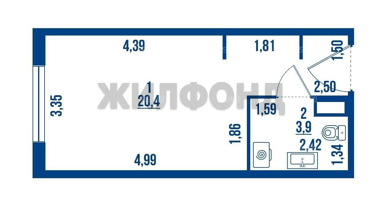 Студия, площадь 24,3 м?, из них кухня - 5 м?.