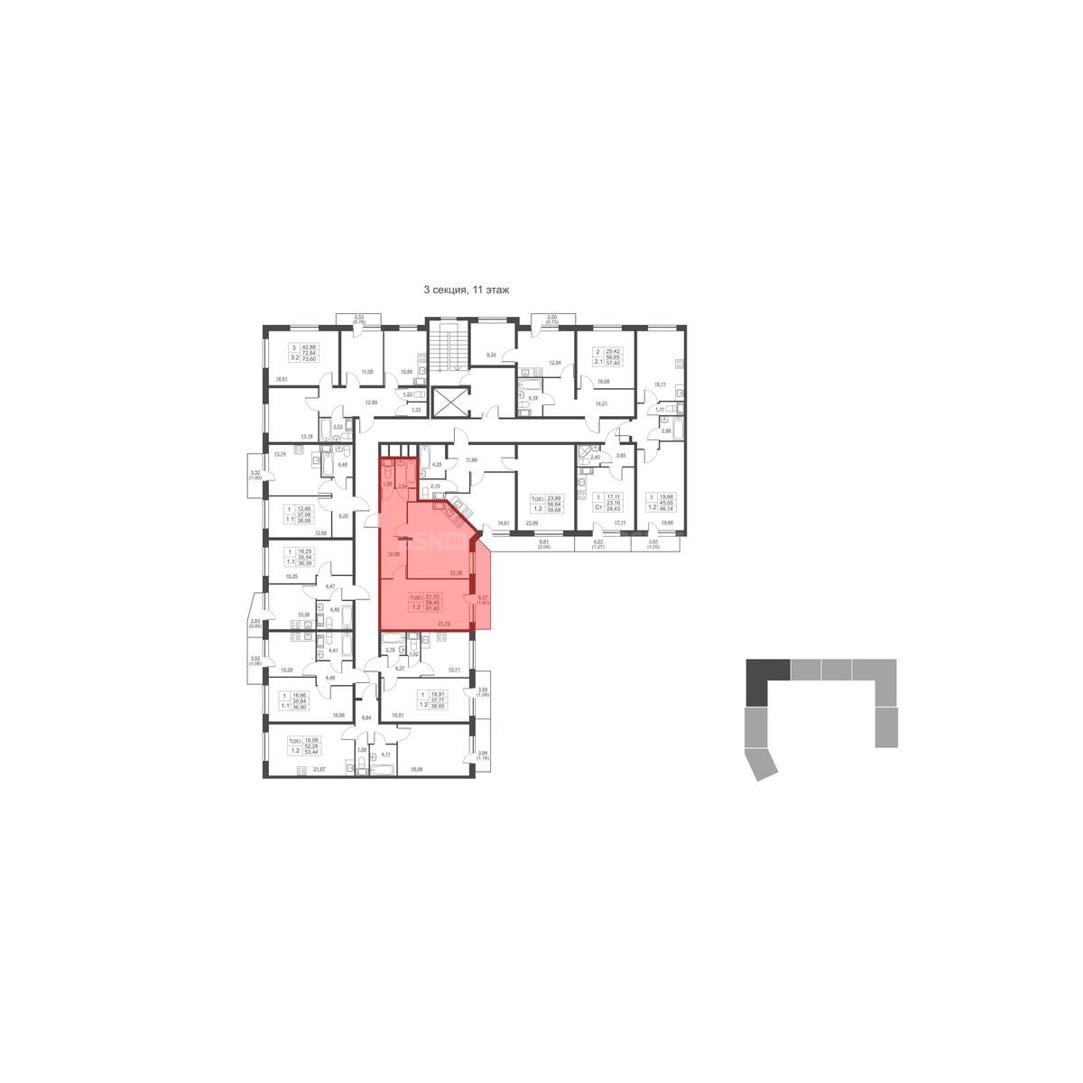 Стоимость данной квартиры (59.20 кв.м.) на 11 этаже 11-этажного дома составляет 6 497 800 рублей.