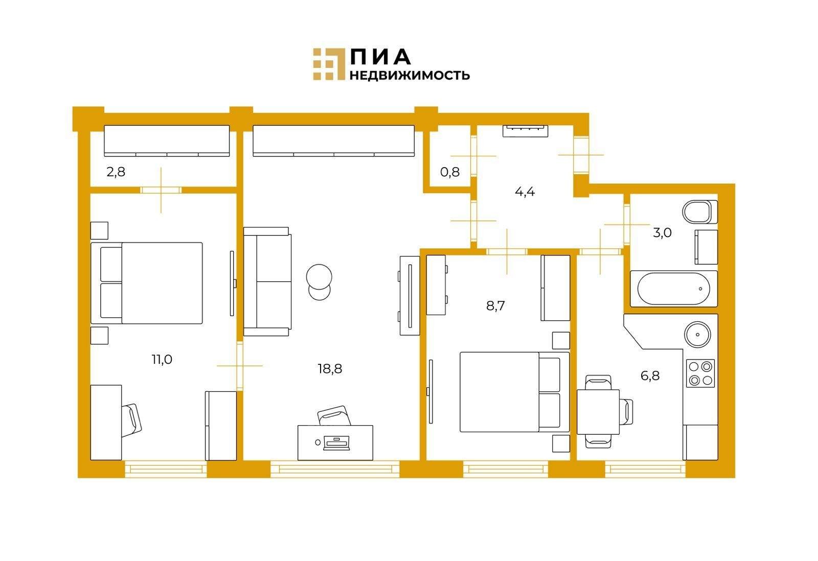 Окна на проспект - вы всегда в центре городской жизни; отличная обзорность, много света.