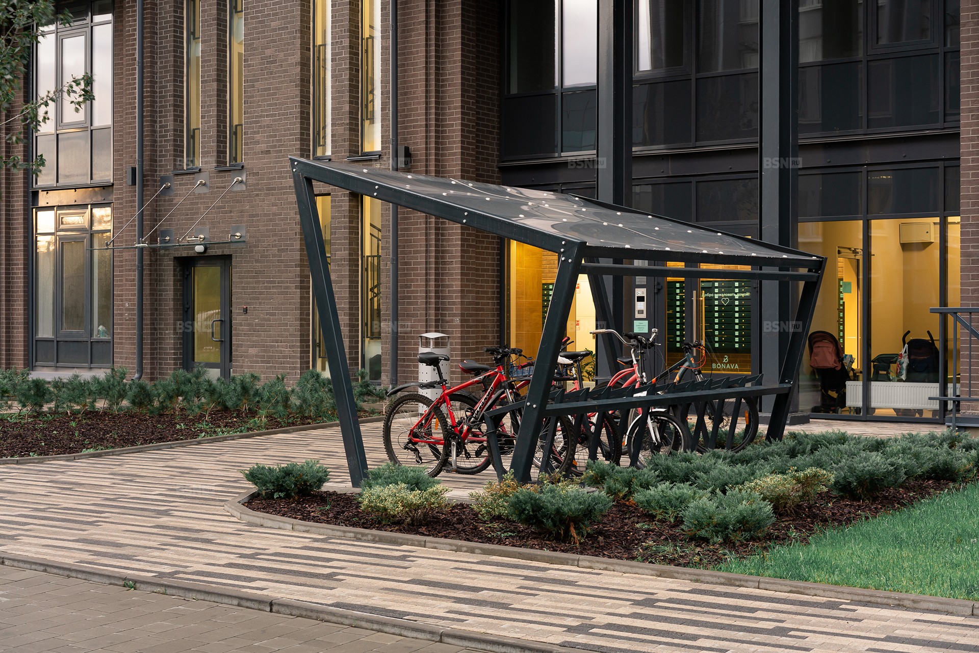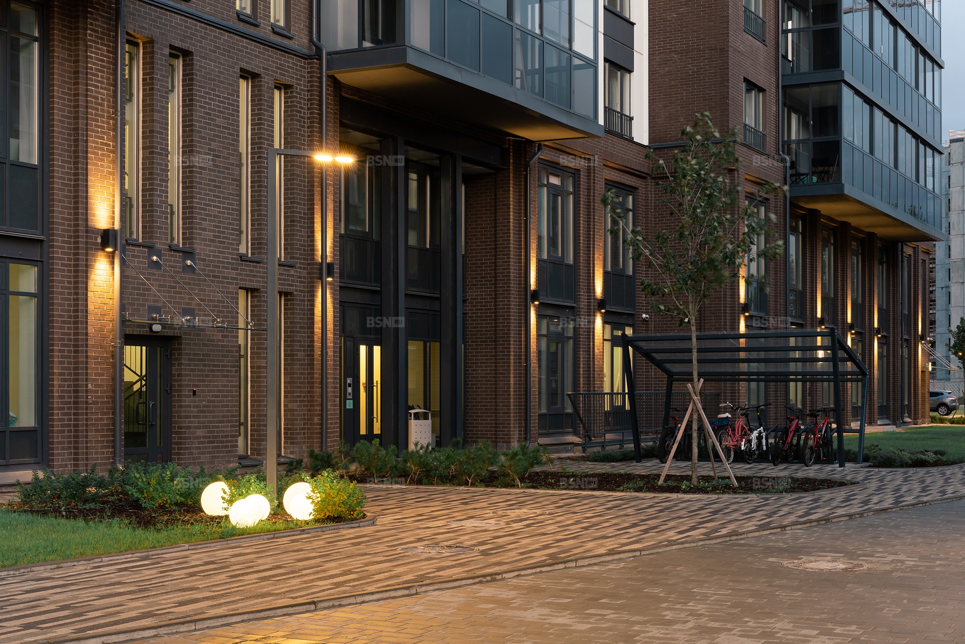 Дома расположены на полностью огороженной и закрытой от посторонних территории с системами видеонаблюдения и контроля доступа. В парадных размещены колясочные, а у входов в подъезды — велопарковки. К подземному паркингу и индивидуальным кладовым можно спуститься на лифте OTIS из своей парадной.