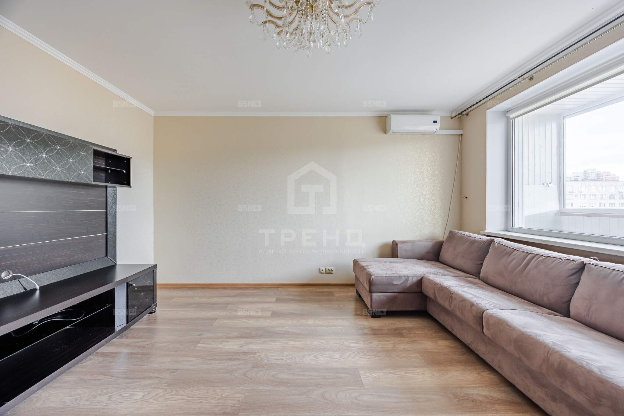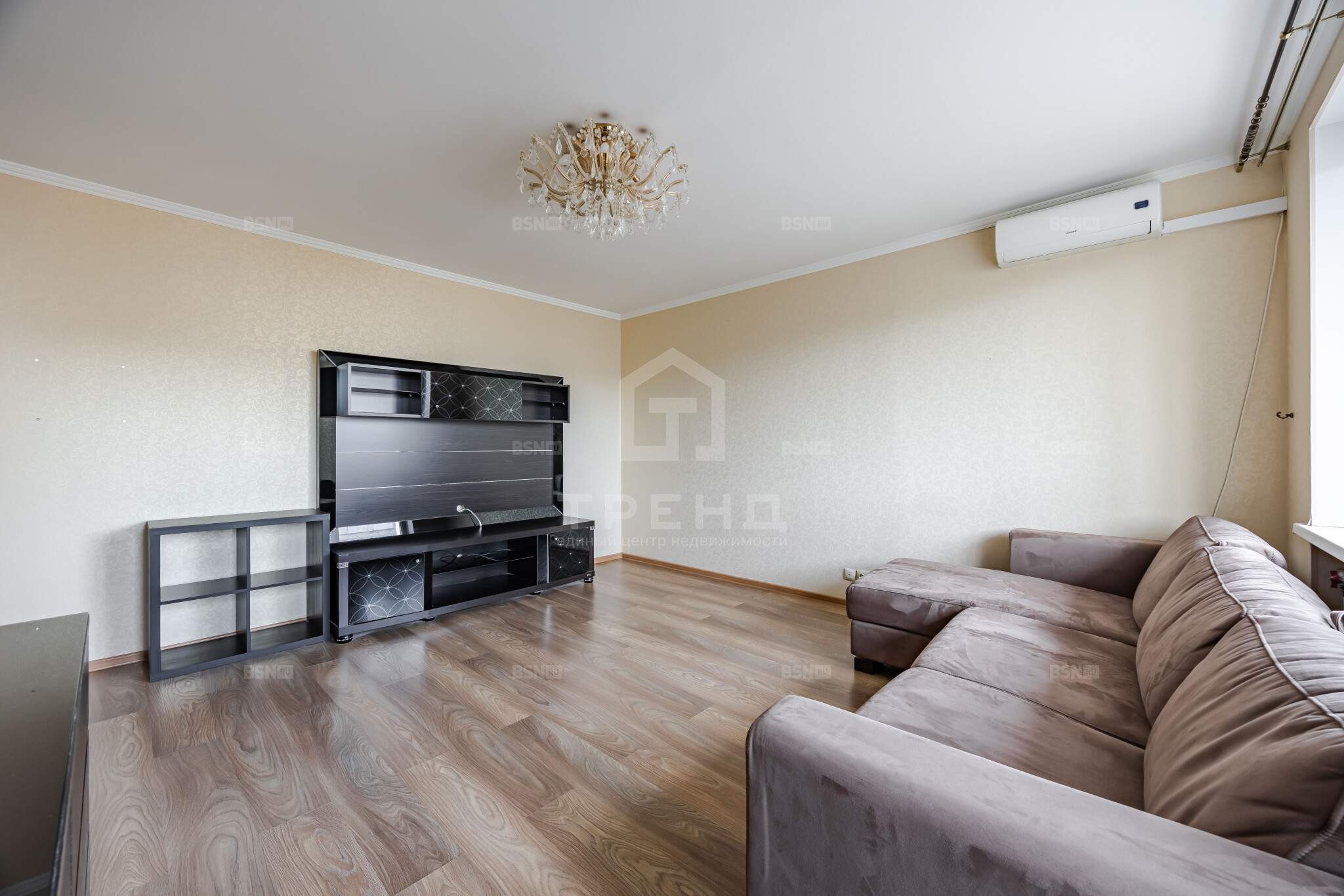- Просторная гостиная квадратной формы с диваном, местом под телевизор и кондиционером