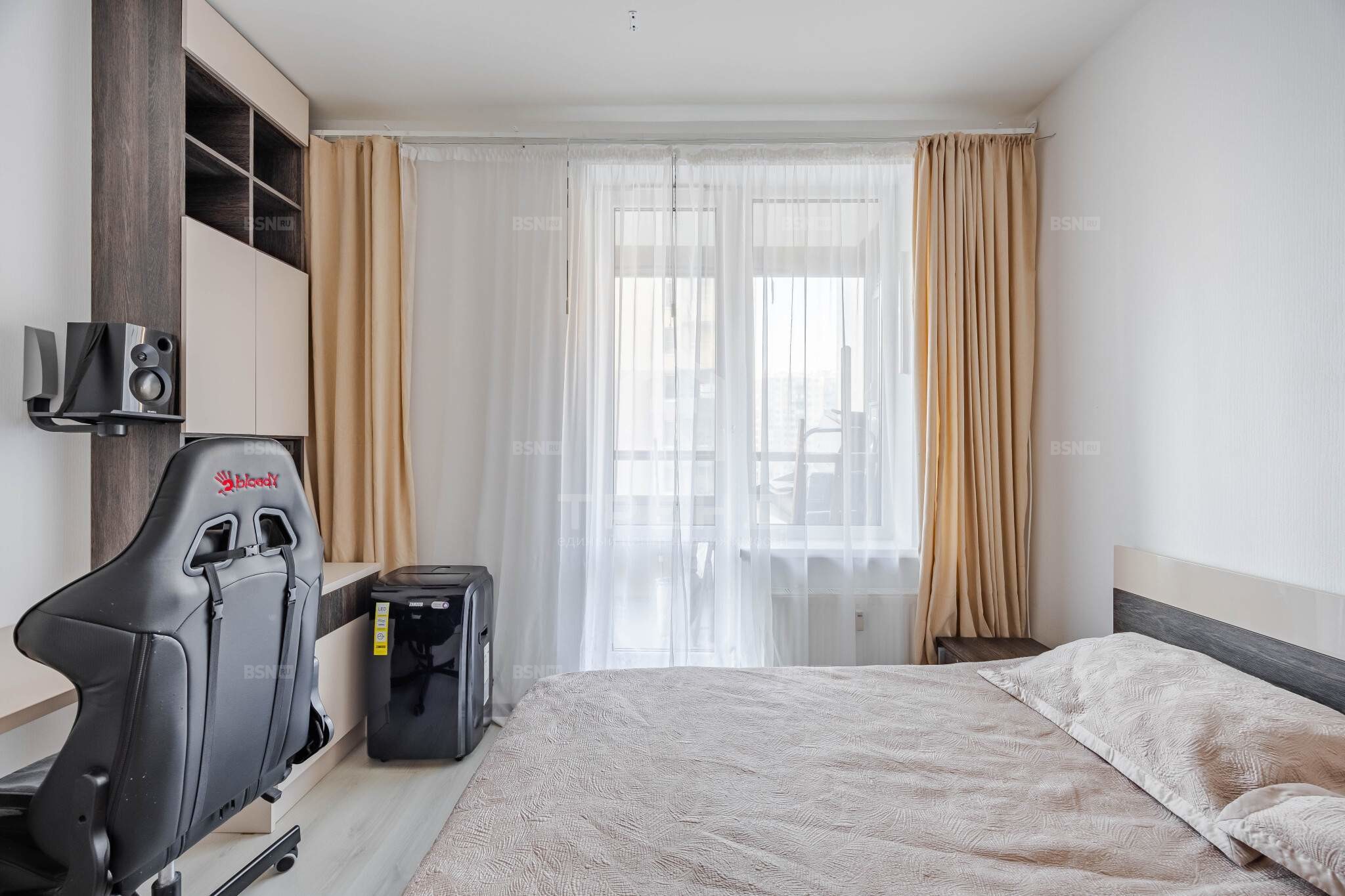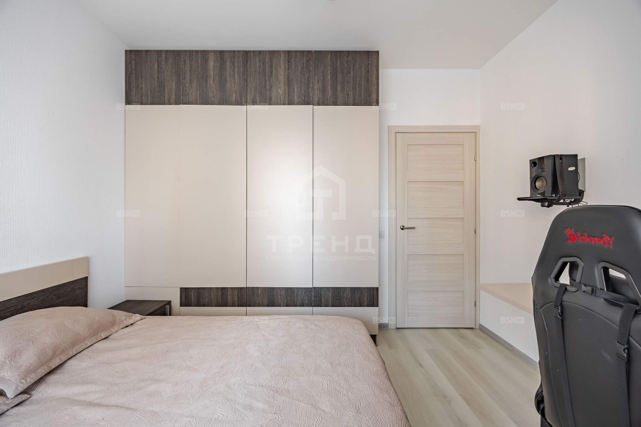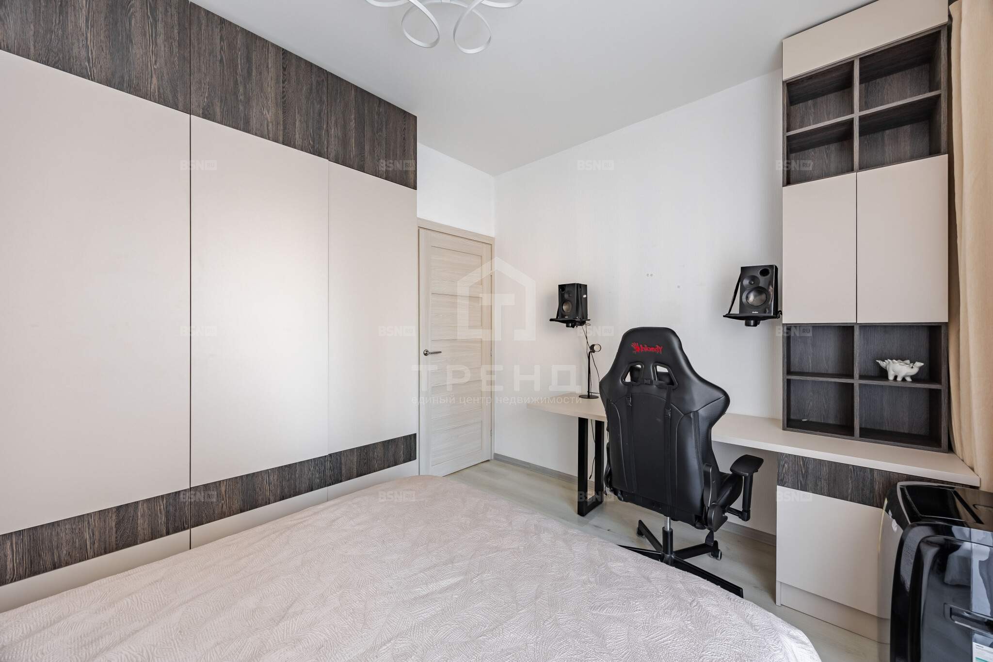 Спальня: полноценная кровать Ascona с матрасом, шкафы-купе до потолка, рабочее место.