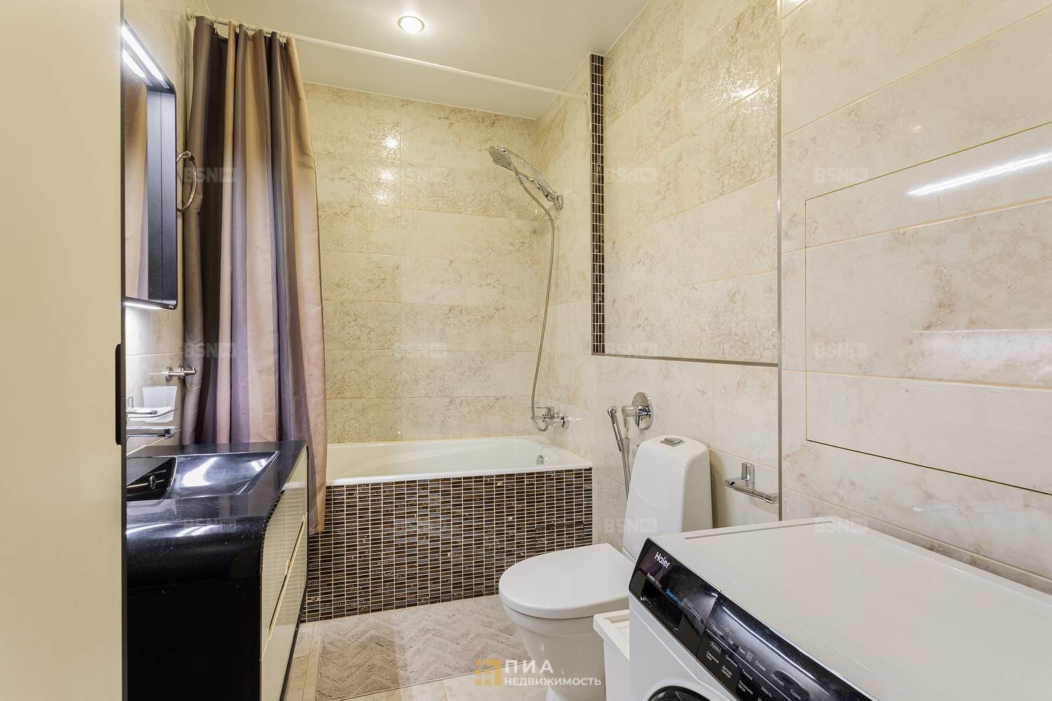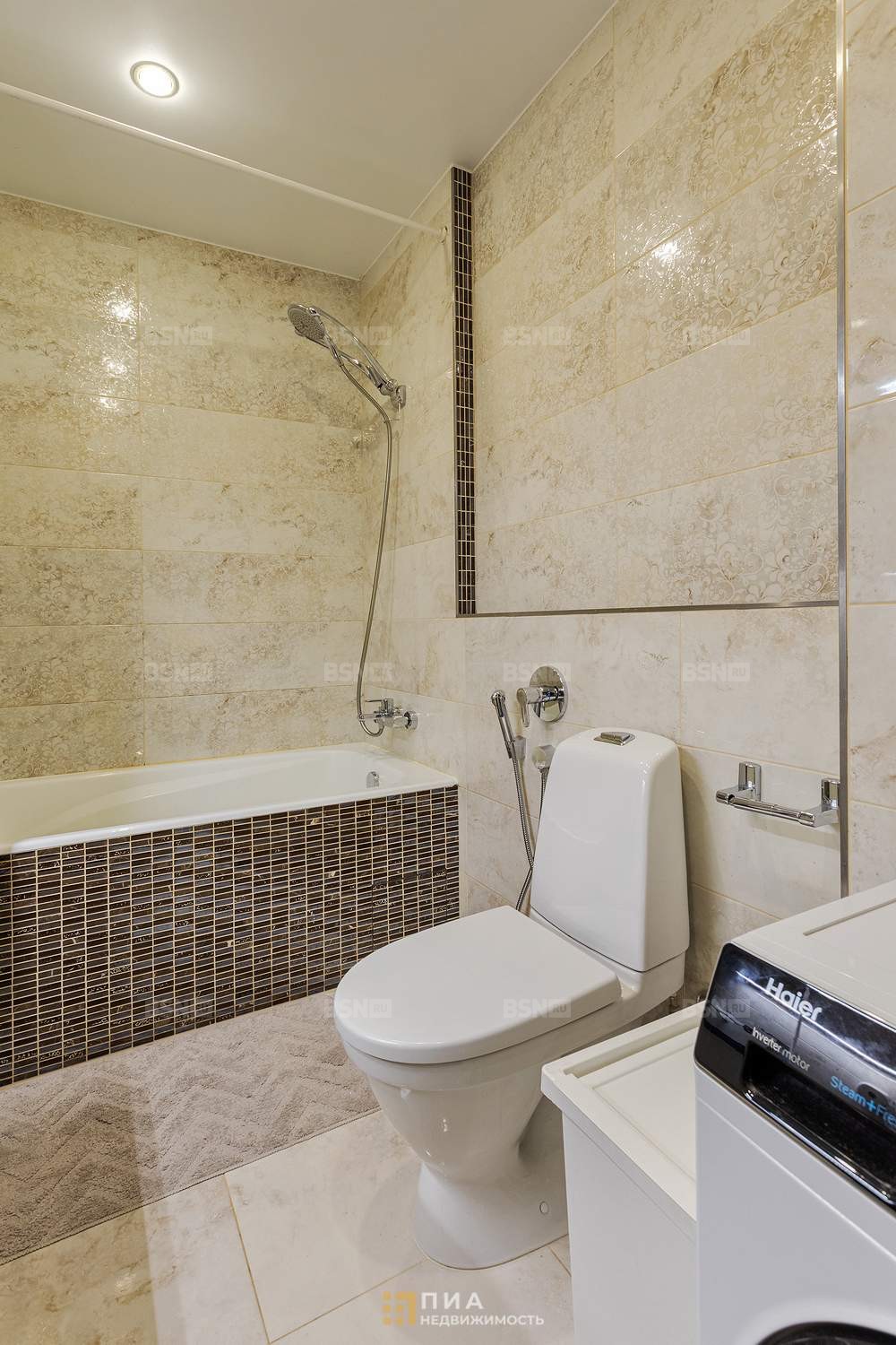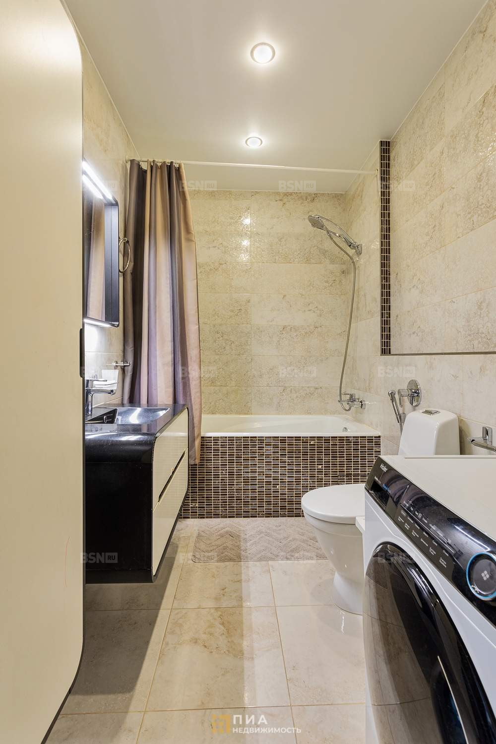 Импортная плитка. Остаётся: чугунная ванна Jacob Delafon, сантехника Hansgrohe с гигиеническим душем, унитаз Gustavsberg, мебель Svedbergs, раковина из литого мрамора.