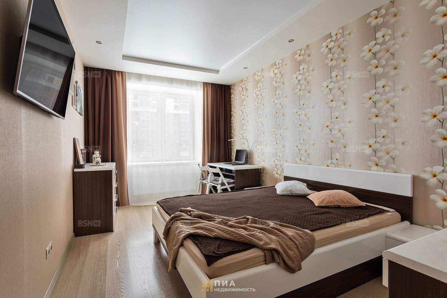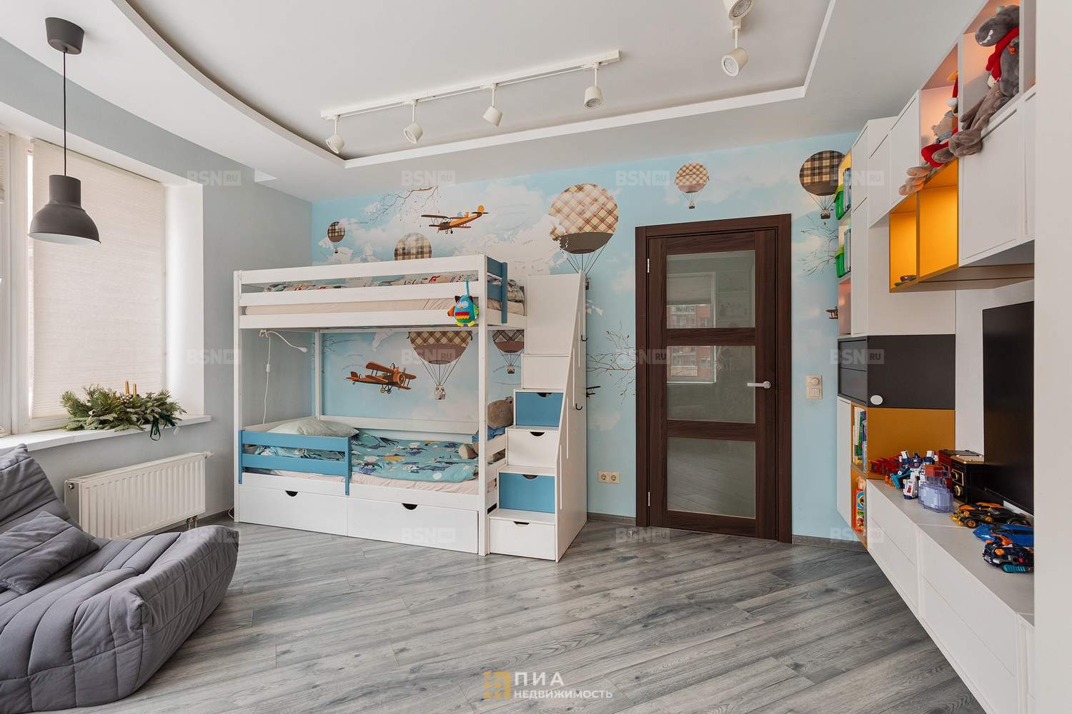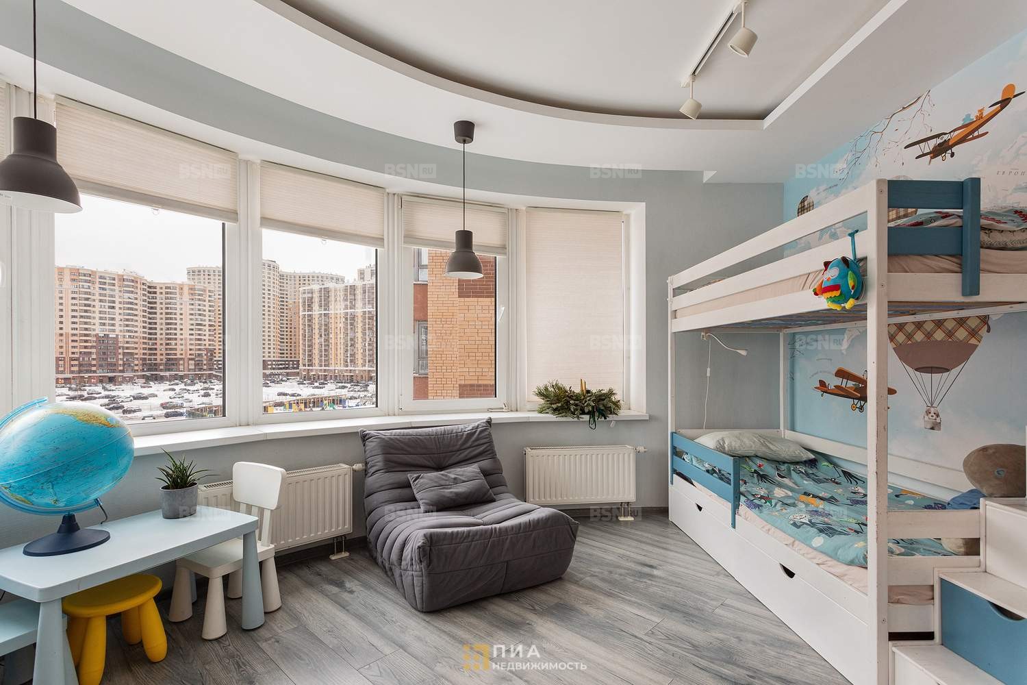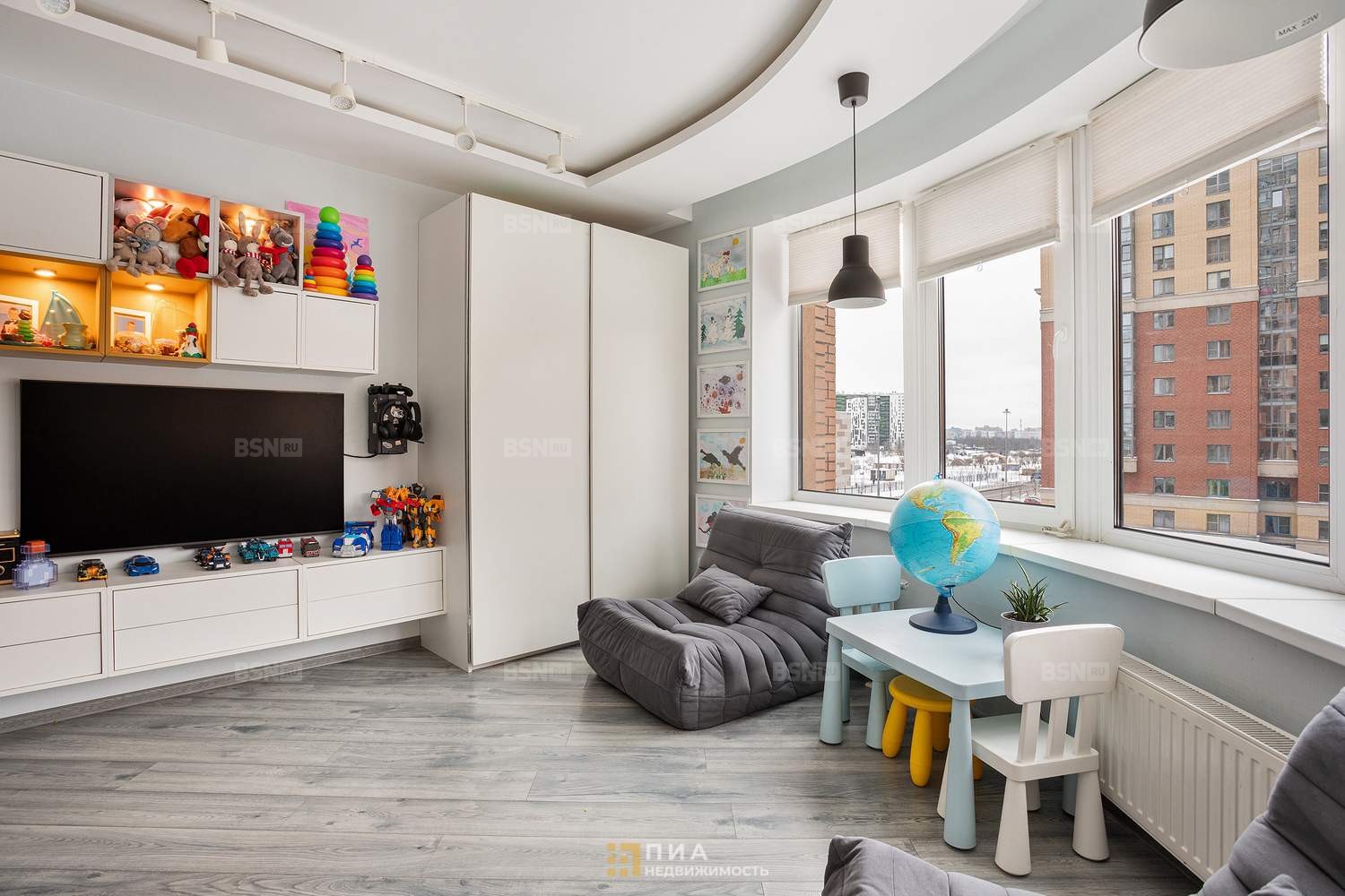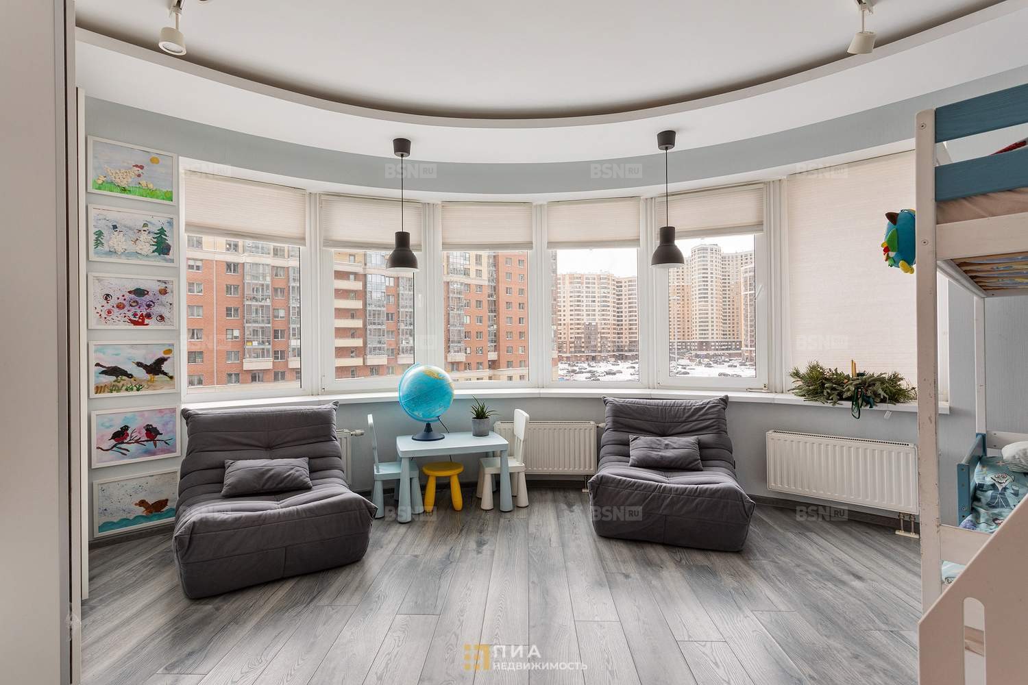 Светлая, просторная, полукруглое окно во всю стену. Индивидуальный дизайн, авторские обои, система хранения с подсветкой. Мебель - по договорённости.