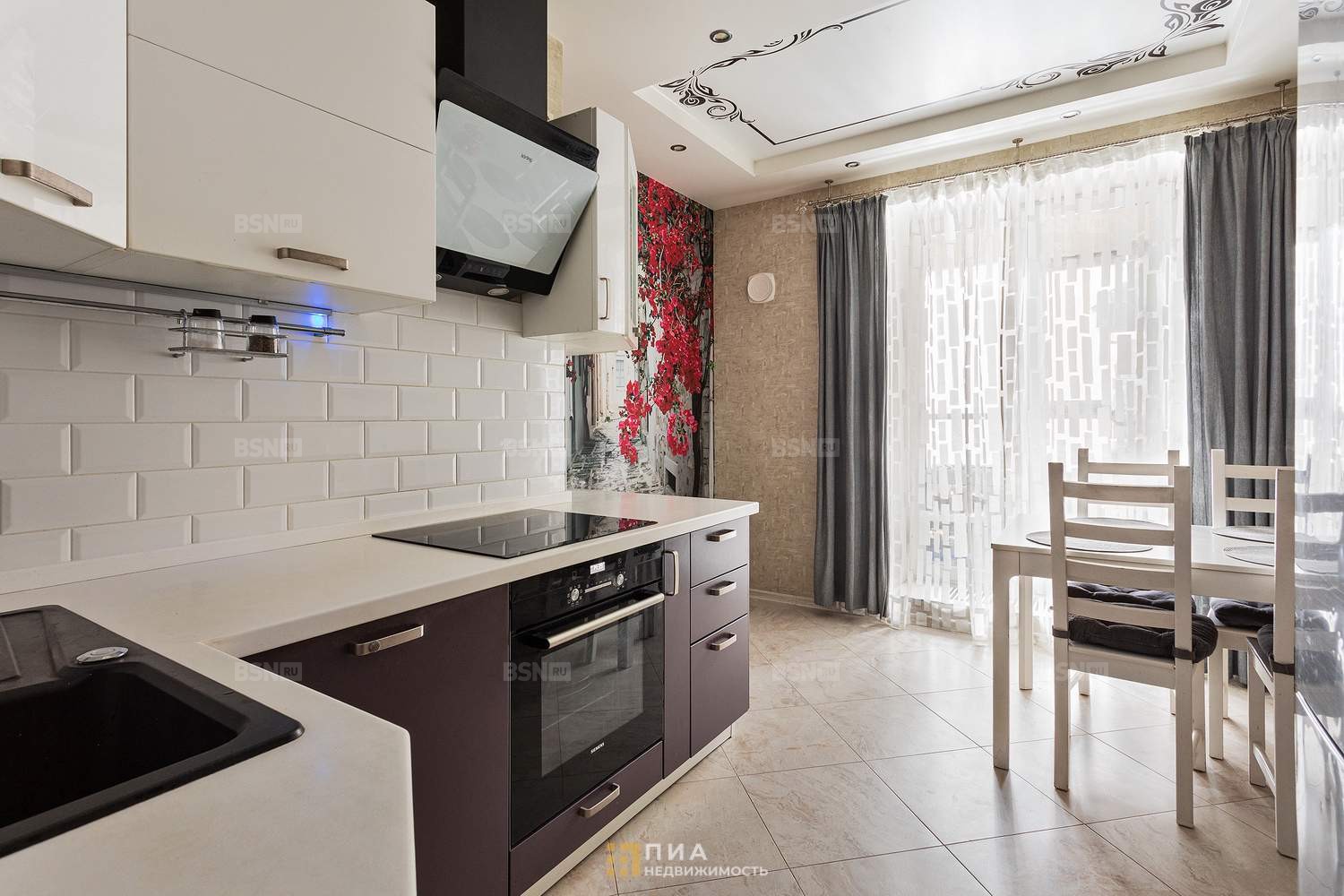 Гарнитур «Кухня Мария», каменная столешница, мойка с измельчителем Status. Покупателю остаётся техника: духовой шкаф и варочная панель Siemens, посудомоечная машина Bosch, вытяжка, система очистки воды Аквафор.