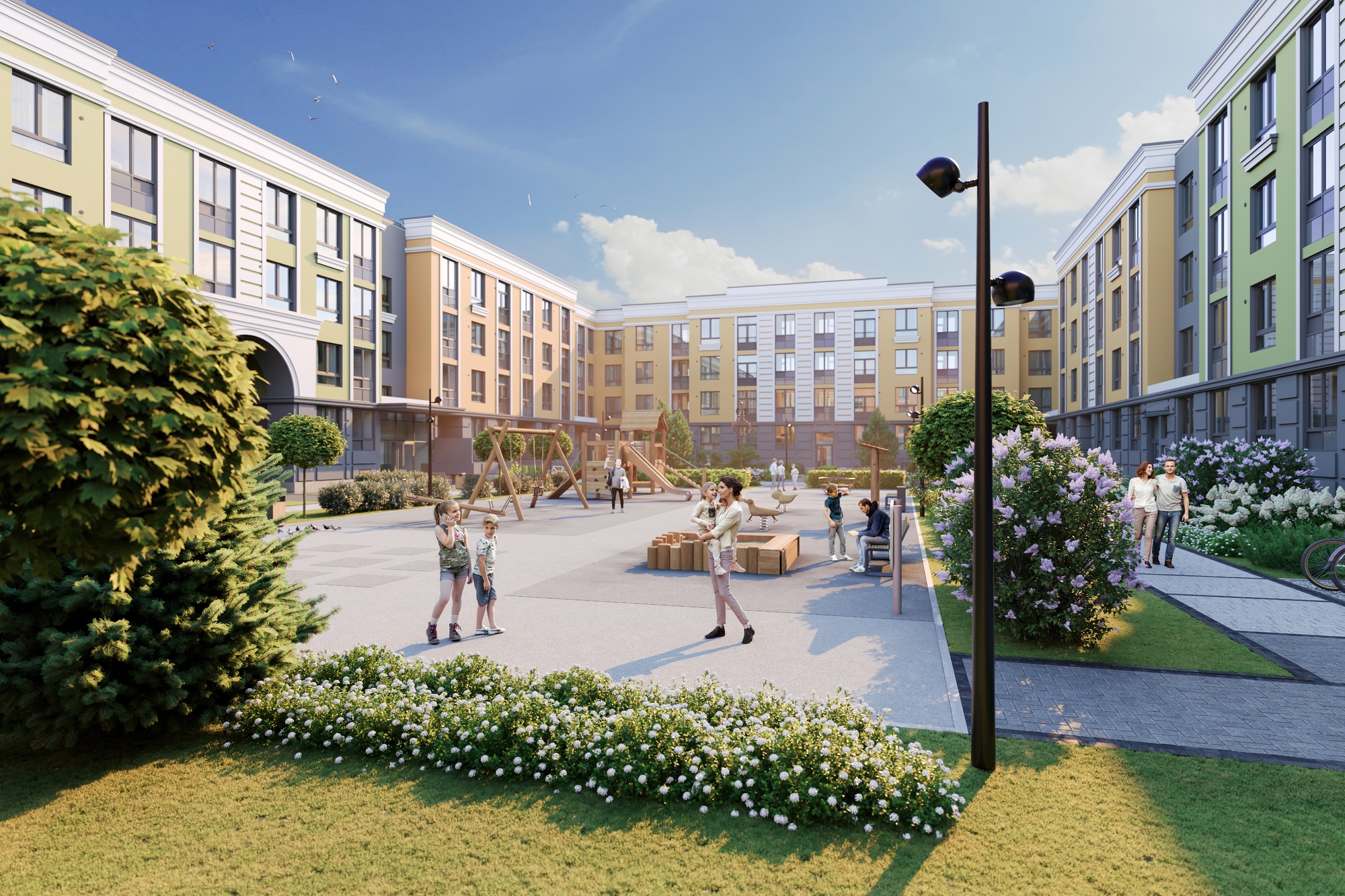 Дворы — не просто зелёные, а наполненные смыслом. У второго корпуса — двор «Вдохновение», вдохновлённый поэтикой Пушкина. Детский игровой комплекс — настоящий центр притяжения. Здесь есть пространство для безопасных игр малышей и более активных занятий для детей постарше. Всё оформлено с использованием экологичных материалов и мягких форм. Зона отдыха с удобными скамьями и обрамлением из живой зелени предназначена для взрослых.